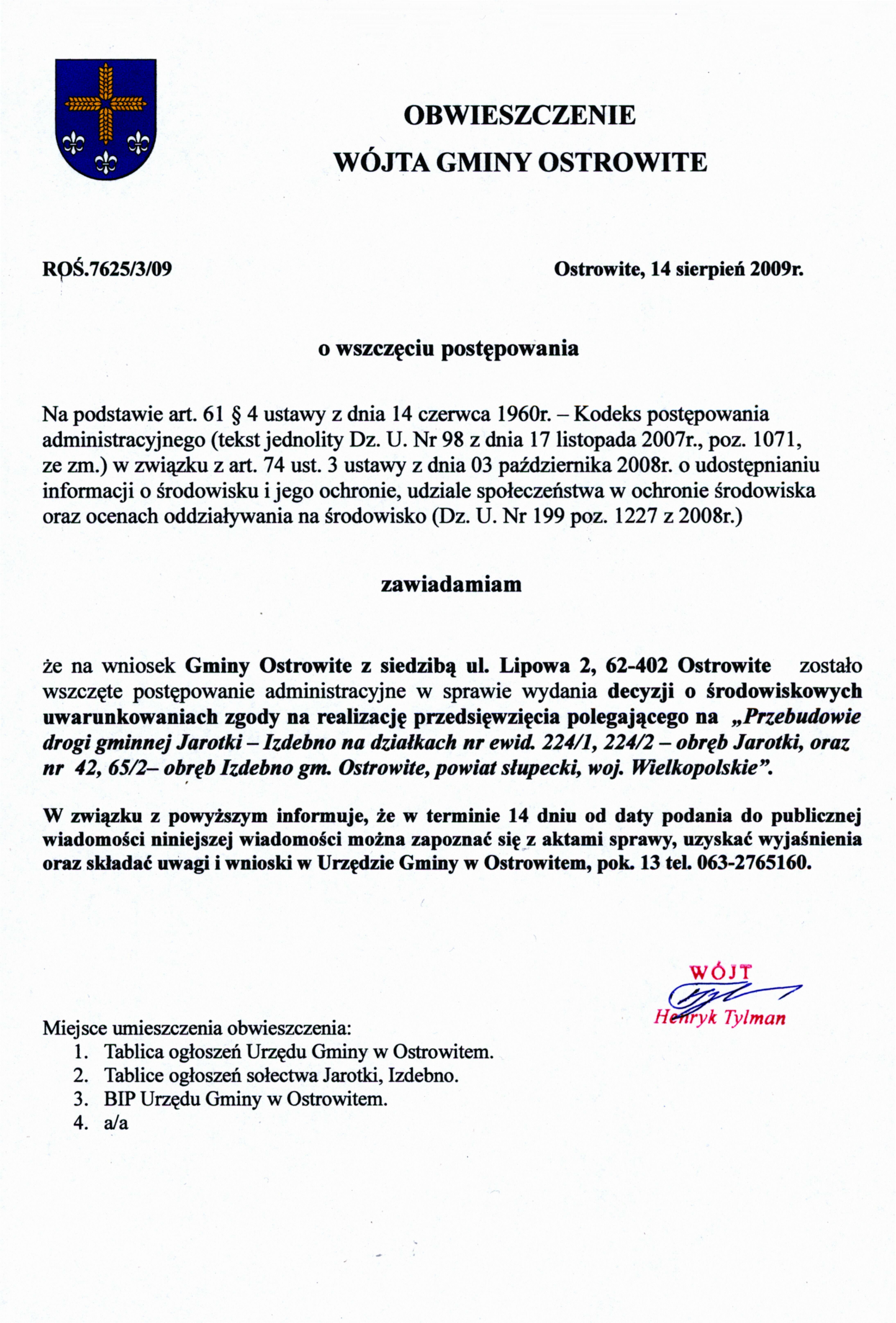 dotyczy wszcz臋cia post臋powania administracyjnego w sprawie wydania decyzji o 艣rodowiskowych uwarunkowaniach zgody na realizacj臋 przedsi臋wzi臋cia polegaj膮cego na przebudowie drogi gminnej Jarotki - Izdebno